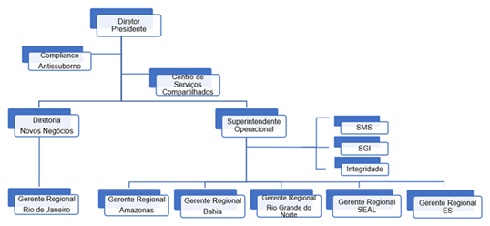 - Segue abaixo o Organograma Corporativo da empresa. Destaca-se a Função de Compliance Antissuborno na estrutura, devidamente assumida por meio de nomeação formal da Presidência, ligada diretamente ao Presidente e com total independência de atuação e autonomia das demais Diretorias e setores.